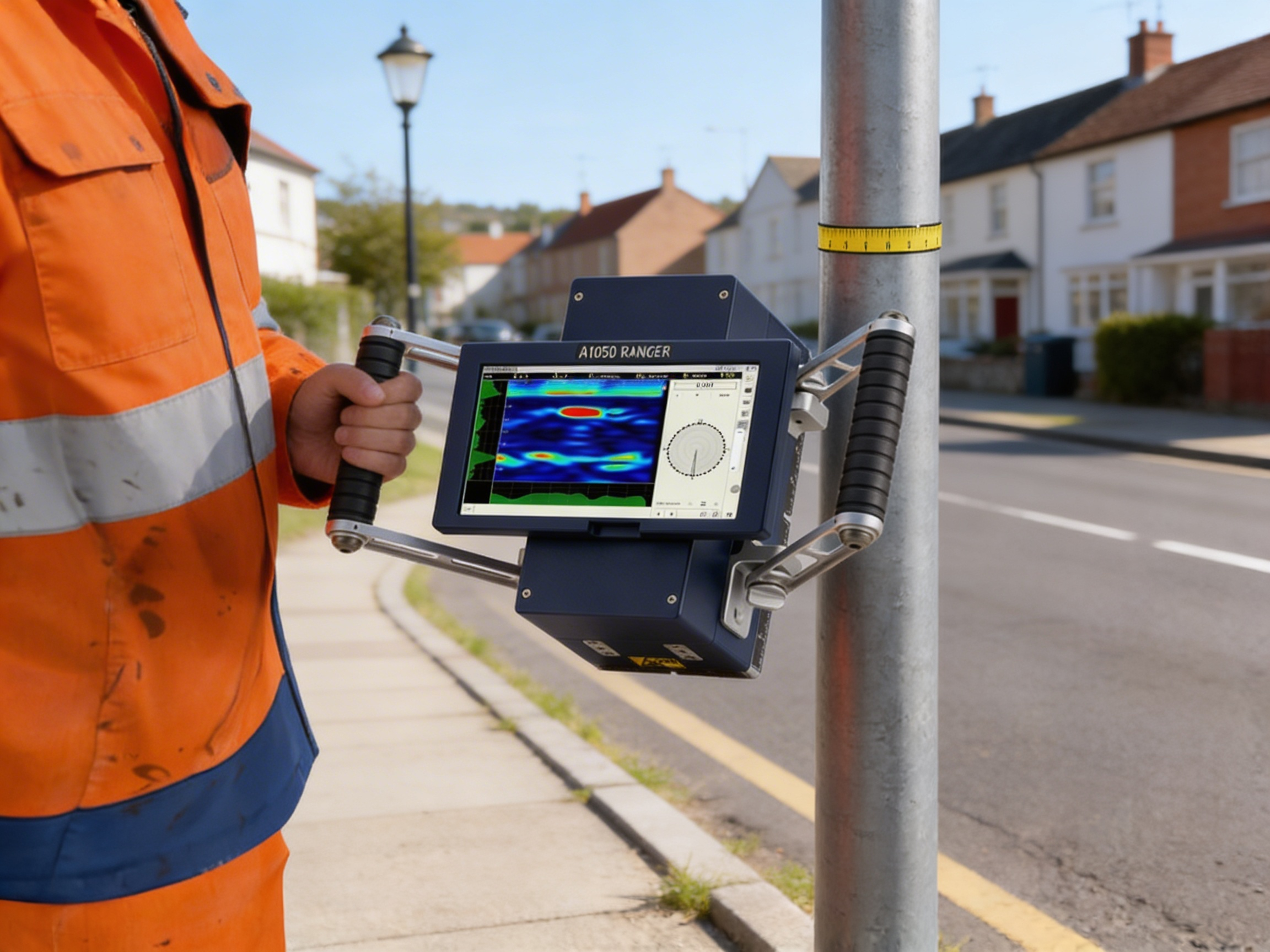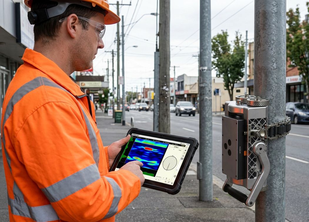 Kompaktowy system inspekcji ultradźwiękowej z falą prowadzoną, przeznaczony do szybkiego wykrywania ukrytej korozji w rurach i słupach oświetleniowych – szczególnie w trudno dostępnych miejscach, takich jak podpory. Wykorzystując przetworniki suchego styku (DPC), system nie wymaga instalacji sprzęgającej i umożliwia sprawne wdrożenie w terenie. Skaner wykonuje pełne skanowanie obwodowe 360°, rejestrując obrazy B-scan o wysokiej rozdzielczości, które wyraźnie wskazują miejsca i stopień korozji. Jego solidna, przenośna konstrukcja i intuicyjna wizualizacja danych sprawiają, że idealnie nadaje się do inspekcji na miejscu, zapewniając wiarygodne wyniki przy minimalnym czasie konfiguracji.